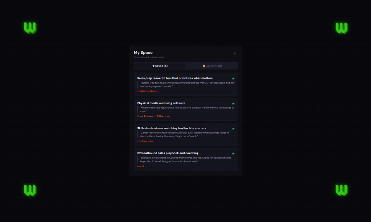 Wasabiは、インターネット上の公開情報を活用して検証済みのビジネスアイデアを提供するプラットフォームです。RedditやHacker Newsなどの情報源からアイデアを収集し、痛点の強さ、需...