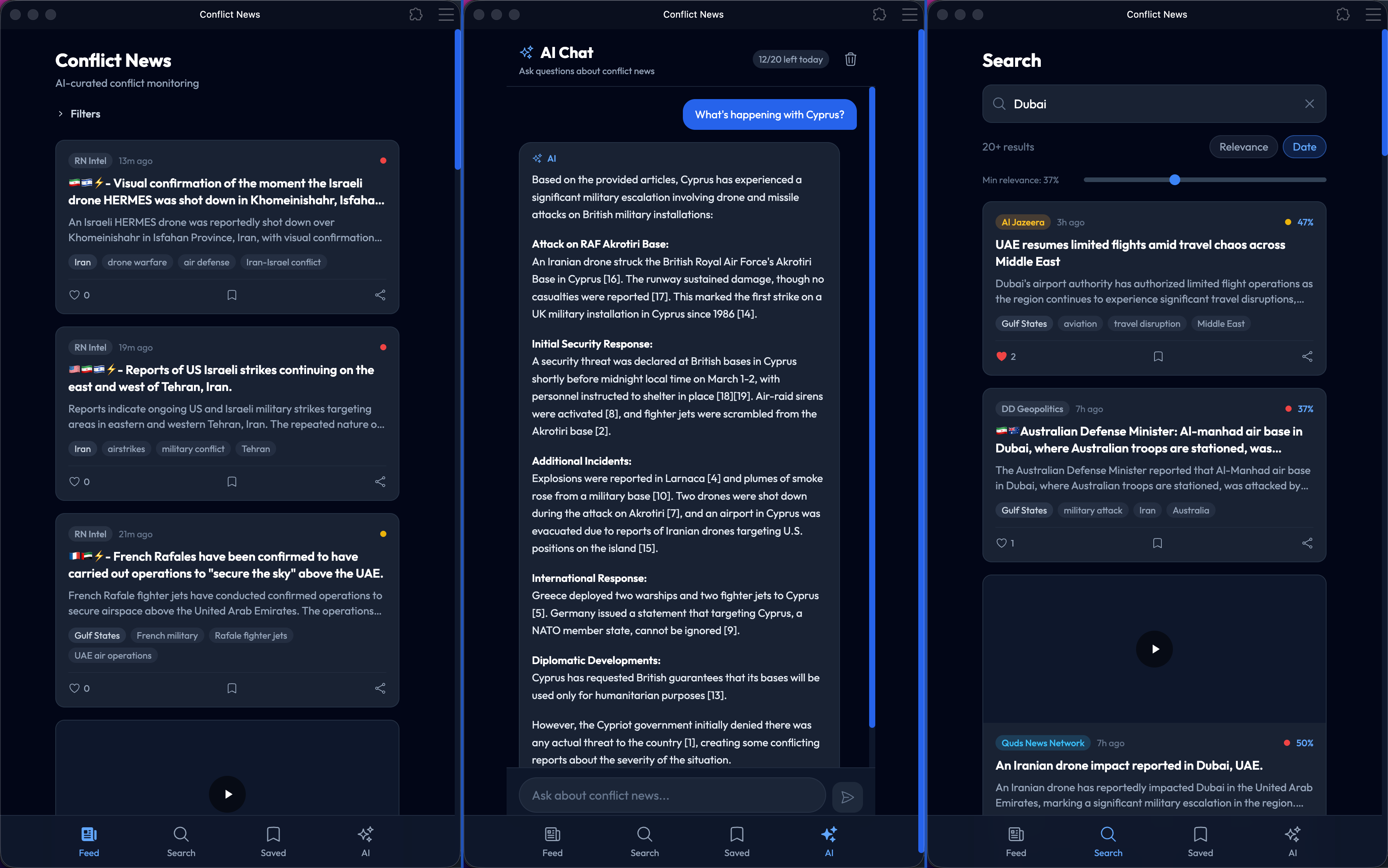 ## 概要 - 世界の紛争ニュースを自動で集約し、リアルタイムのフィードとして提供 - 記事の閲覧・保存・トピック別検索が可能 - 内蔵AIチャットは、進行中の紛争について質問に対し、根拠となる...