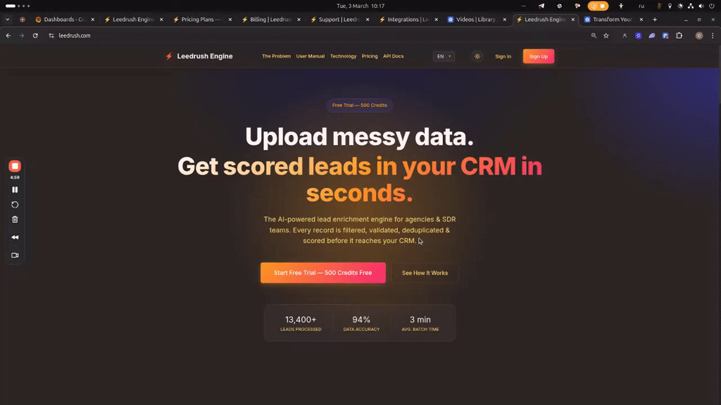 Leedrushは代理店・SDRチーム向けのAI搭載リード強化エンジン。汚いデータによりセールス時間の30〜40%を浪費する課題を解消するべく、アップロード後約60秒でクリーンなCRM準備済みリ...