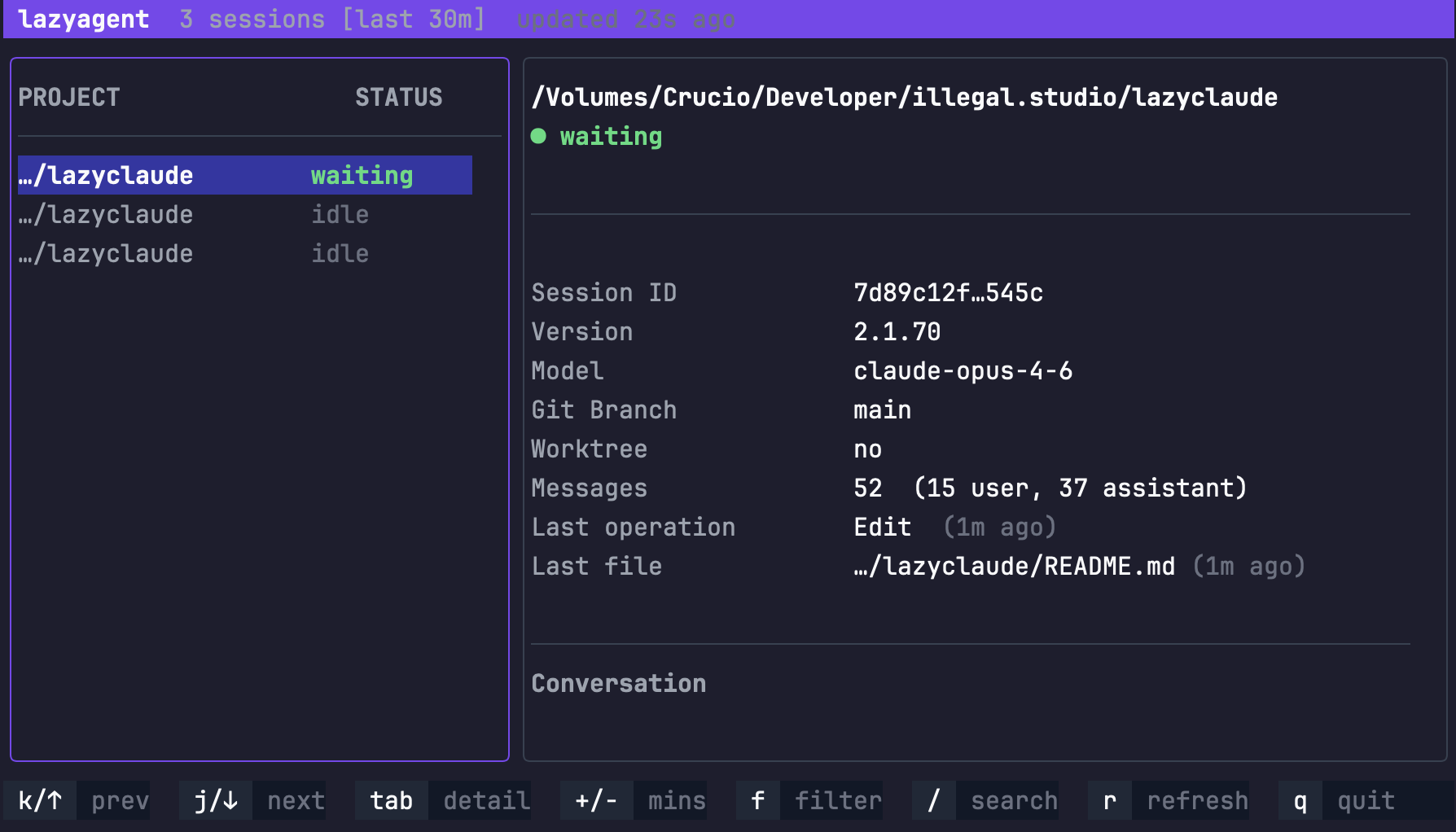 A lazy TUI for monitoring Claude Code agent sessions - illegalstudio/lazyagent