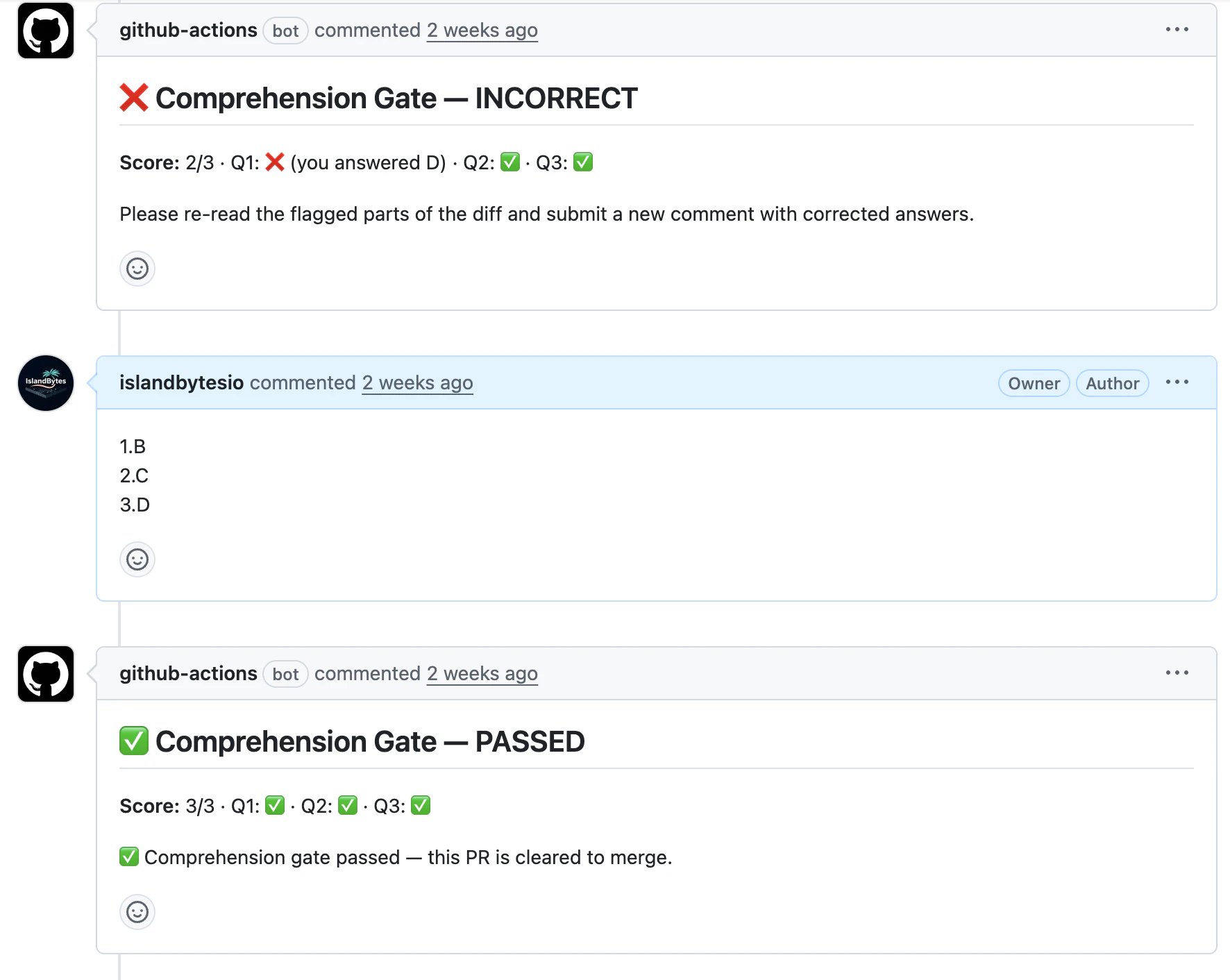 CCG is a GitHub Action that blocks PR merges until the author correctly answers comprehension que...
