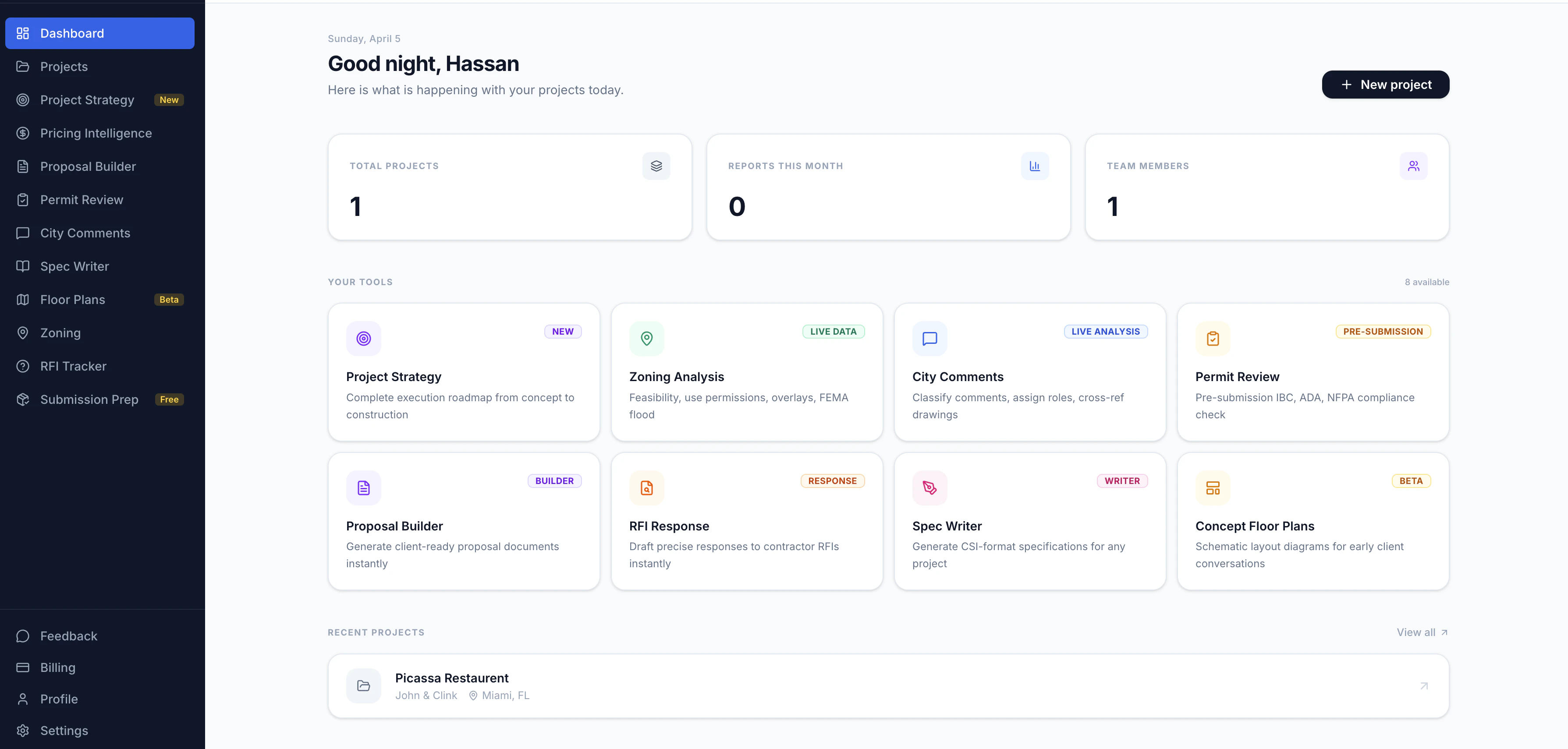 AI-powered permit review, zoning analysis, proposals, RFI management, and project strategy. Truss...