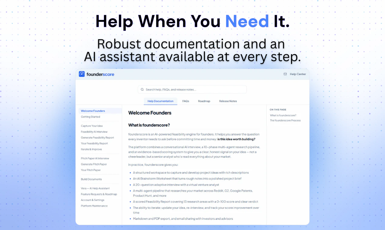 founderscore runs a 10-phase AI research pipeline on your startup idea and returns an honest feas...