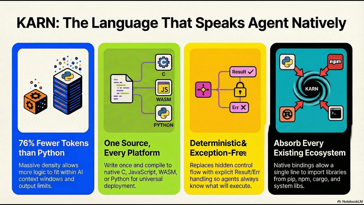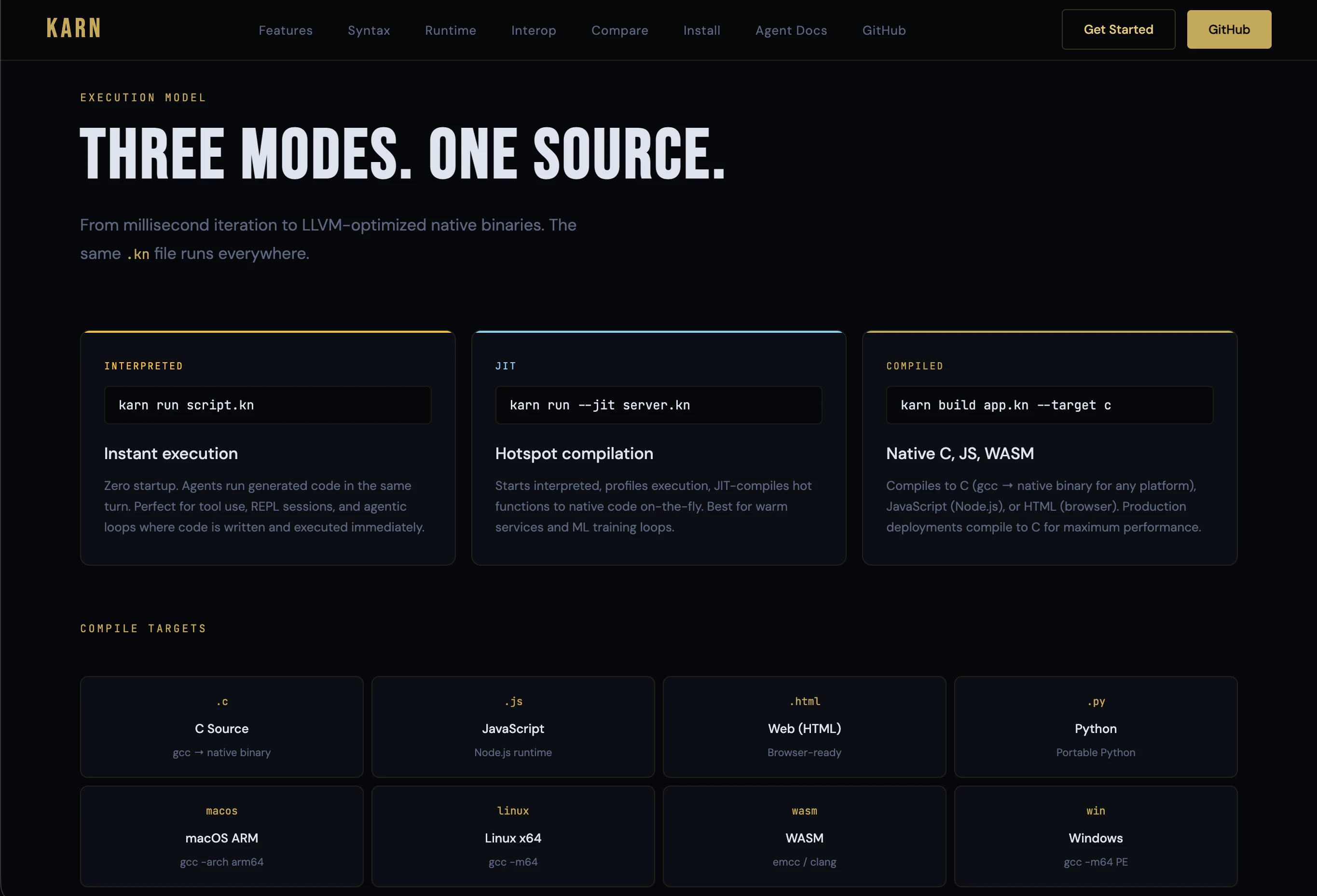 Token-minimal syntax. 76% fewer tokens than Python. Compiles to C, JavaScript, HTML, or Python fr...