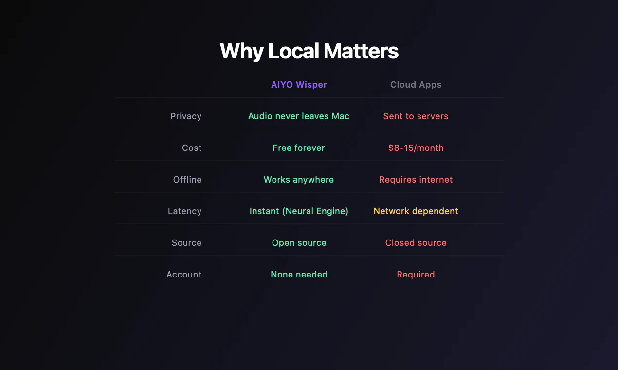 Hold a hotkey, speak, text appears at cursor. AIYO Wisper runs 100% on your Mac using Apple's Neu...