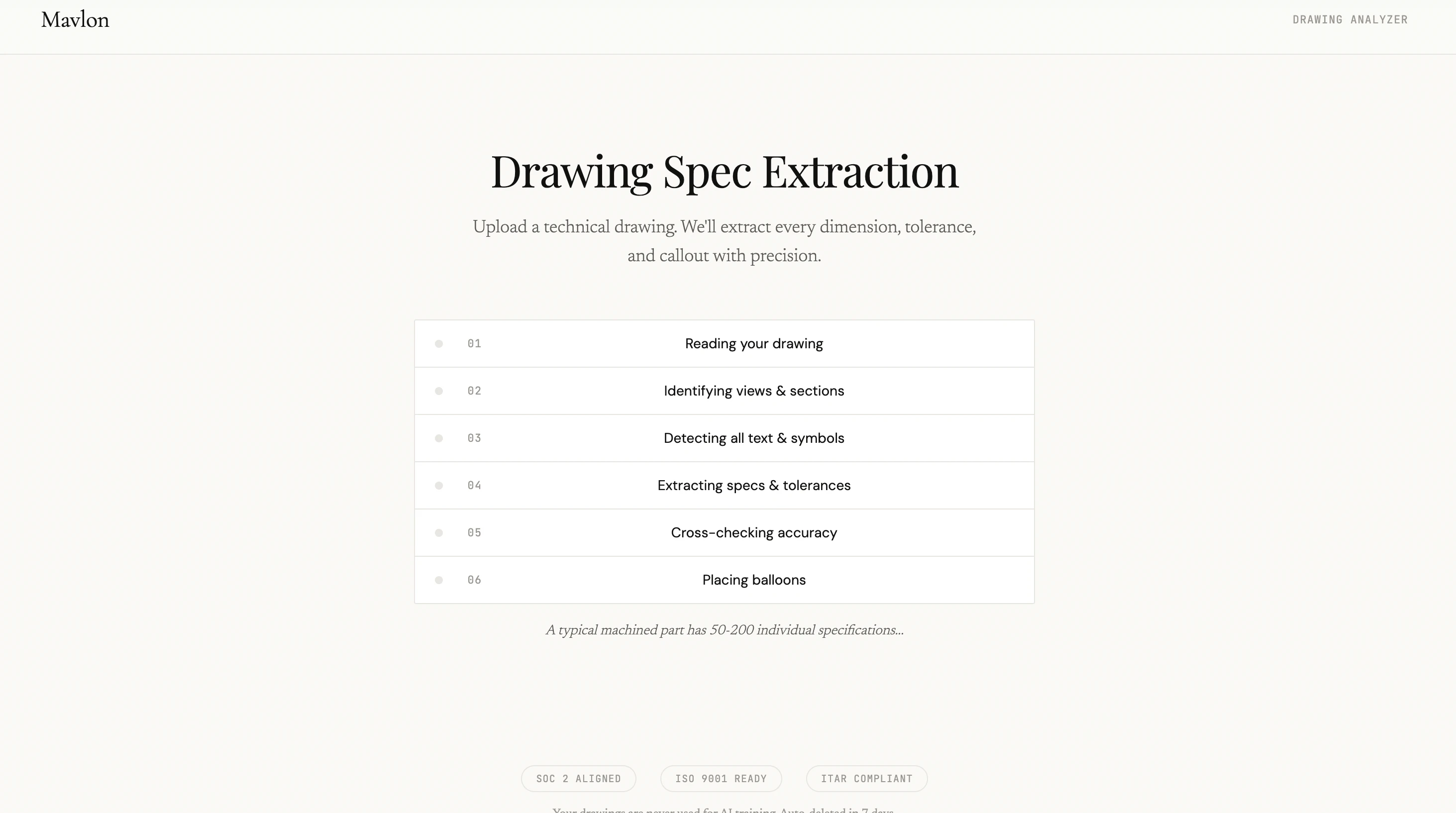 Mavlon is AI drawing intelligence for aerospace subcontractors and precision machine shops. Extra...