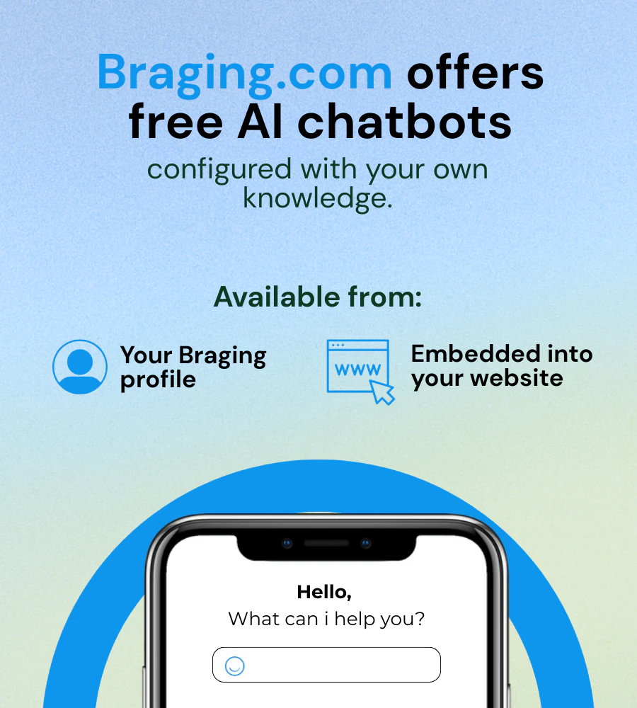 Braging AI empowers everyone with their own free AI chatbot which can be embedded into any websit...
