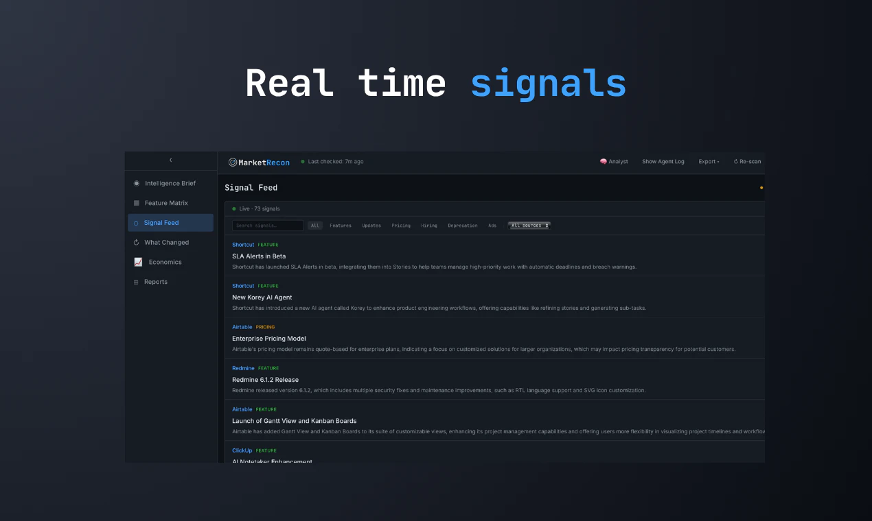 Stop building manual competitor spreadsheets. MarketRecon deploys AI agents to map feature gaps, ...