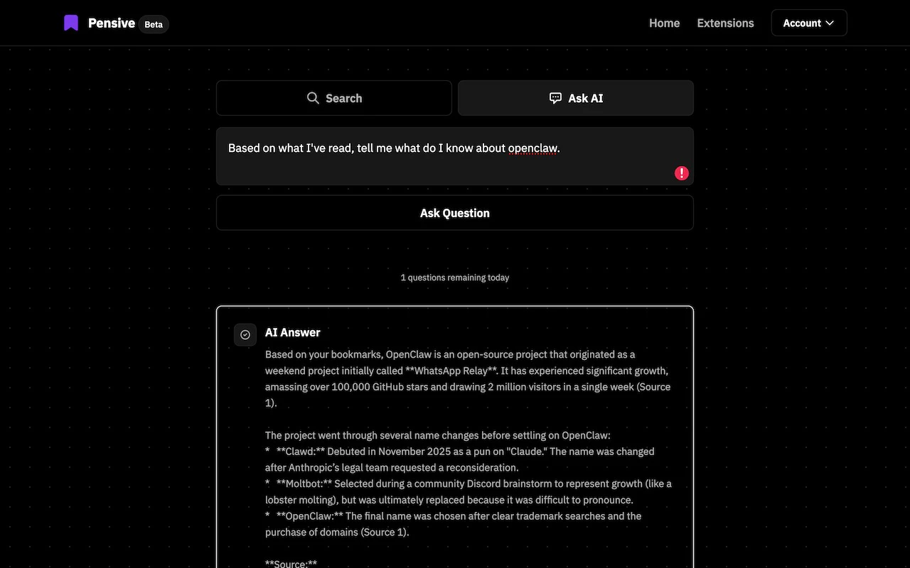 Save anything. Find everything. Actually understand it. Full-text search across everything you've...