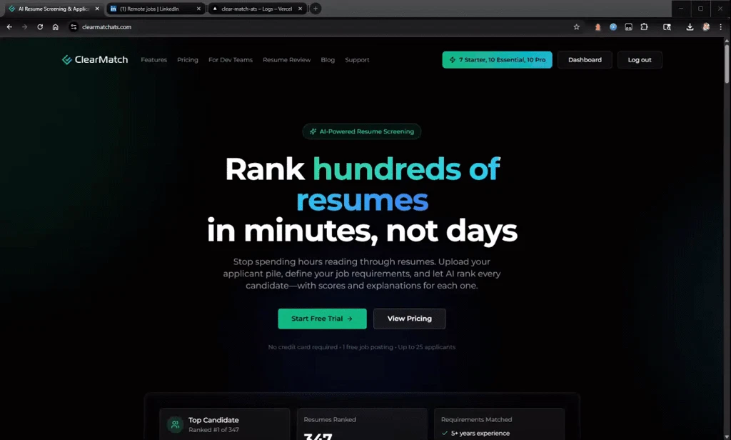 ClearMatch is an AI-powered ATS that screens hundreds of resumes in minutes. Upload a job descrip...