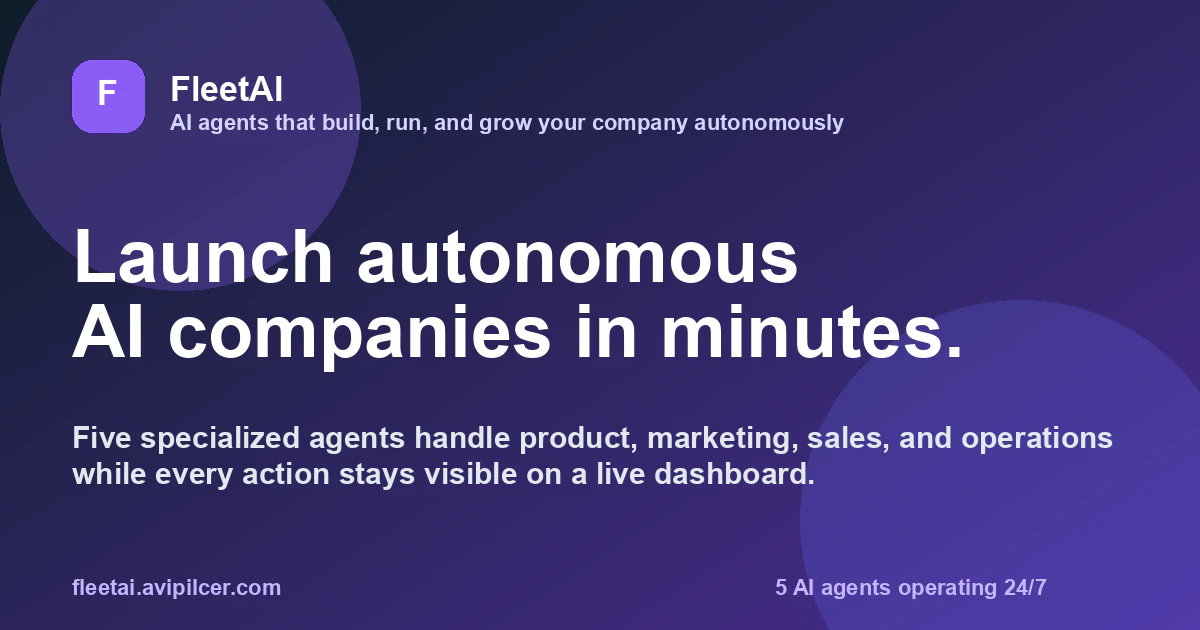 FleetAI lets you launch an autonomous AI company in 60 seconds. Describe your company idea, and 5...