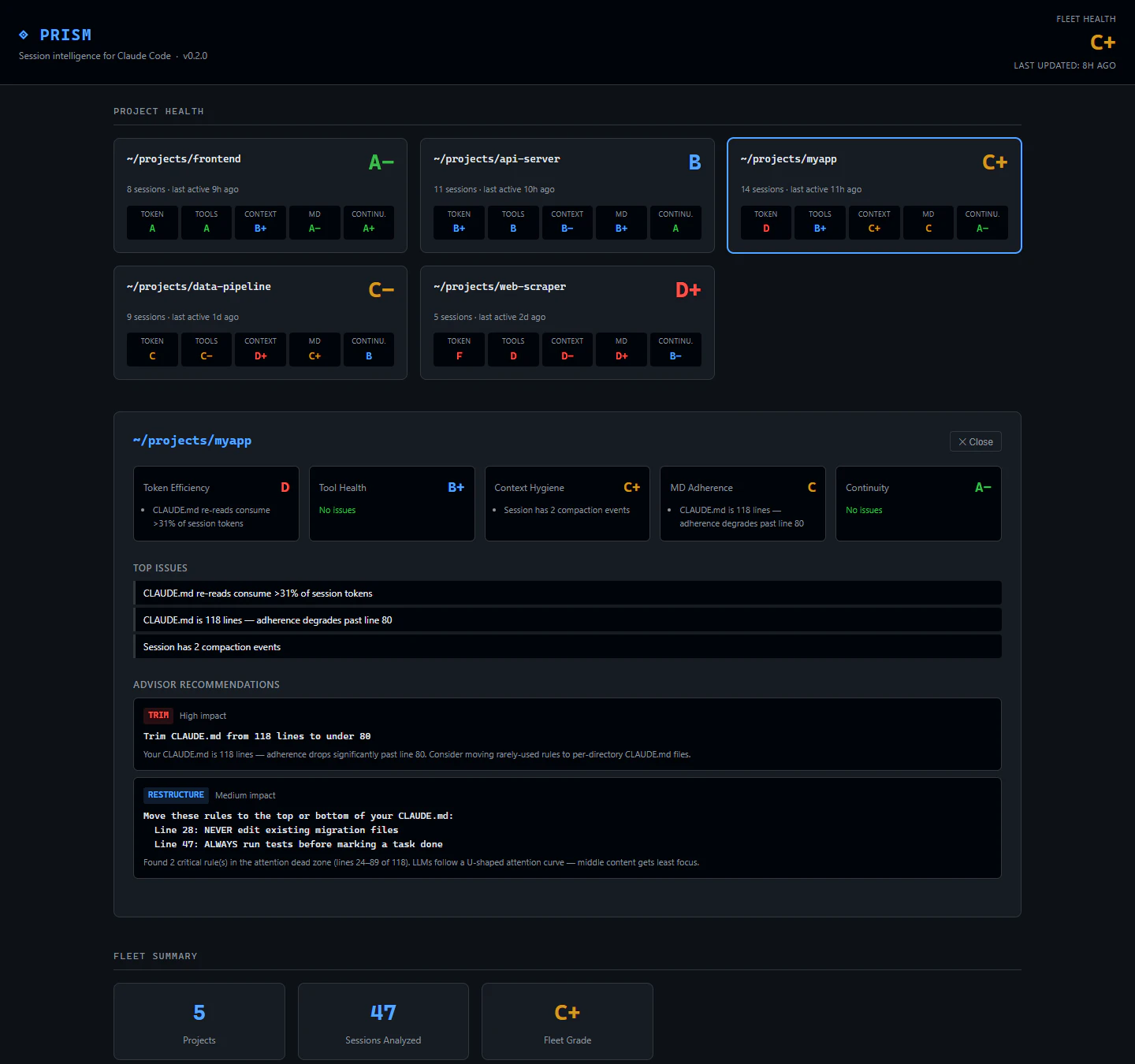 PRISM reads Claude Code's session JSONL files and tells you exactly why your tokens are disappear...