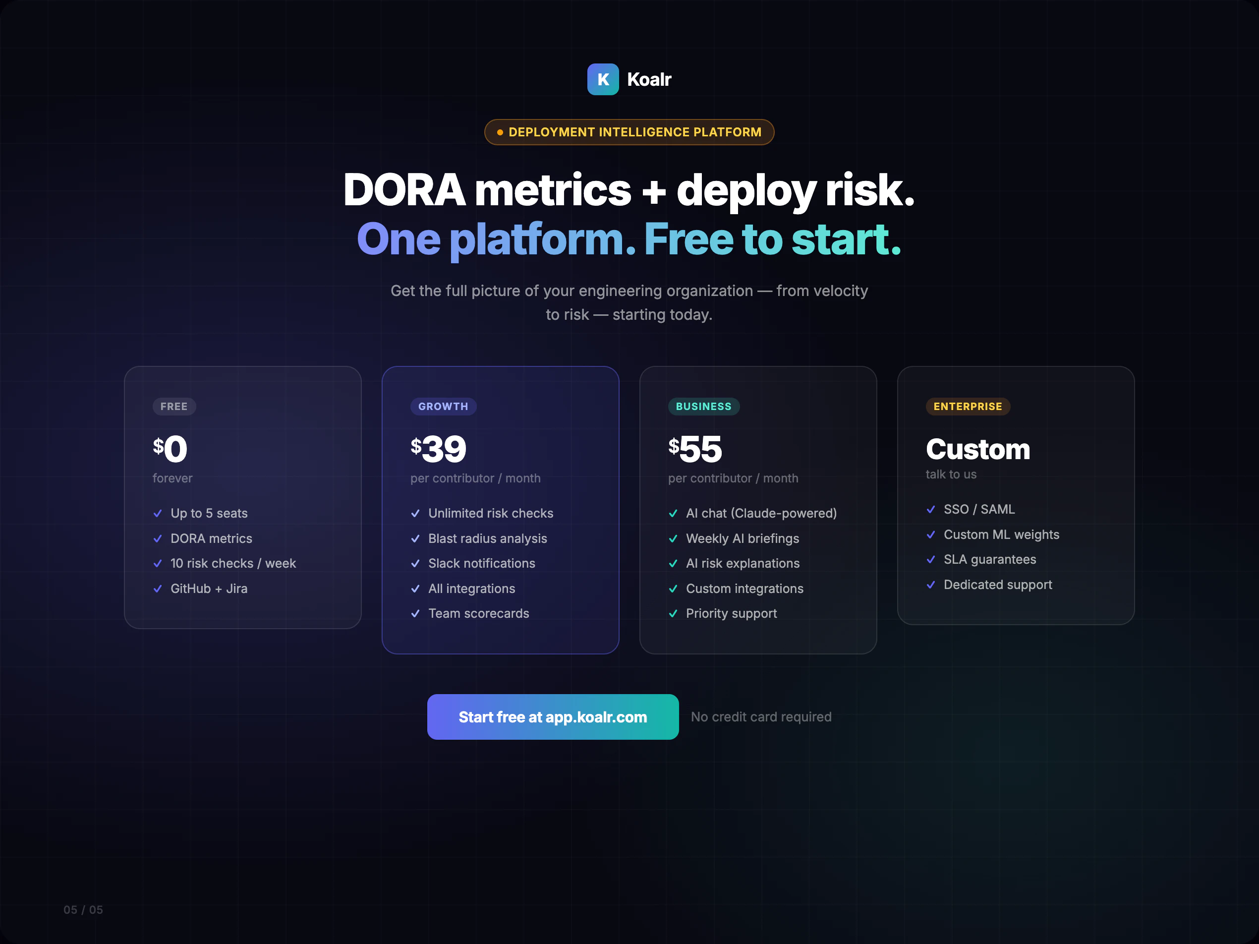 Koalr scores every PR 0–100 for deploy risk using 36 signals — coverage delta, file expertise, ch...