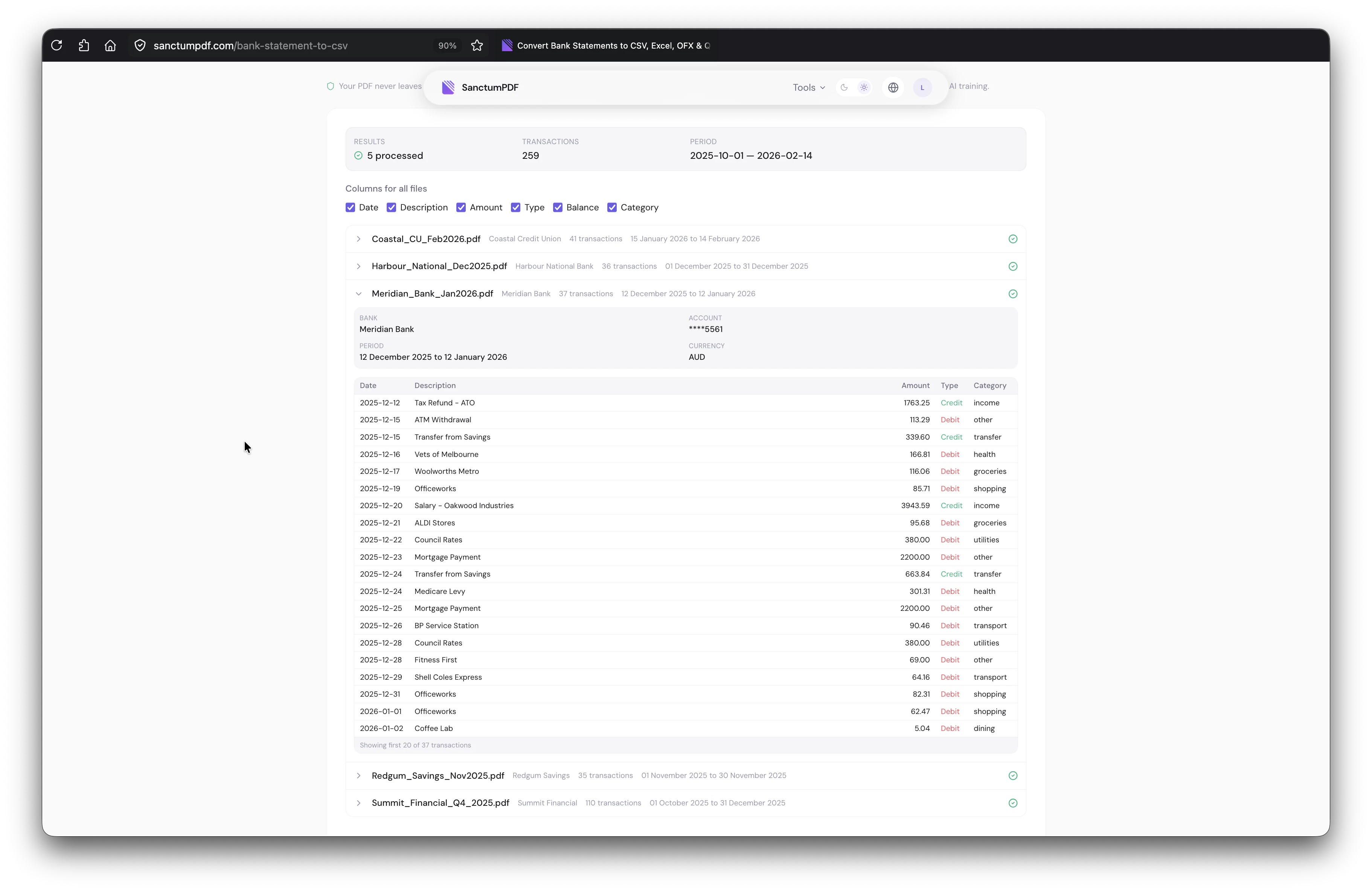 Extract transactions from PDF bank statements using AI and exports to CSV, Excel, JSON, OFX, or Q...