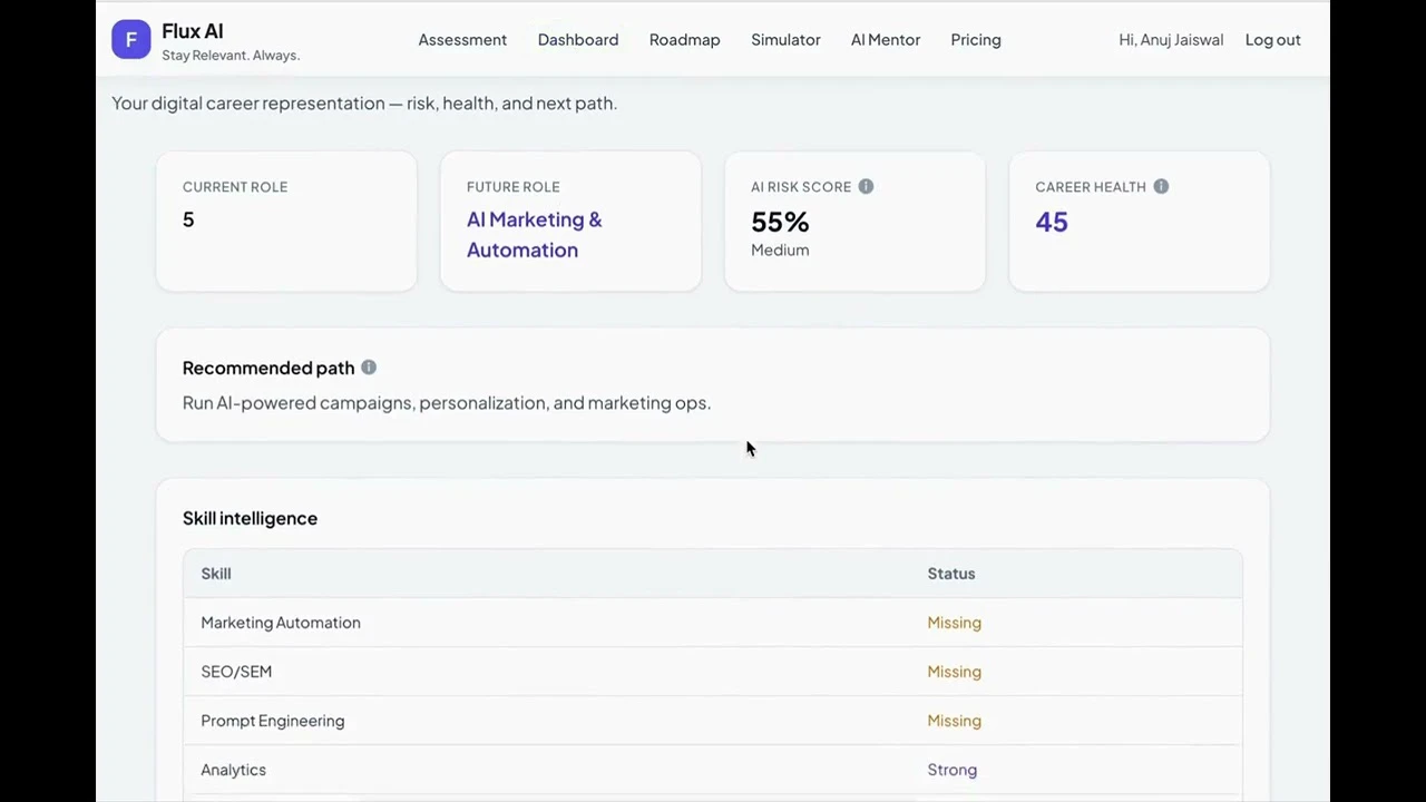 Flux AI analyzes your resume and career profile to calculate your AI career risk score. It then r...