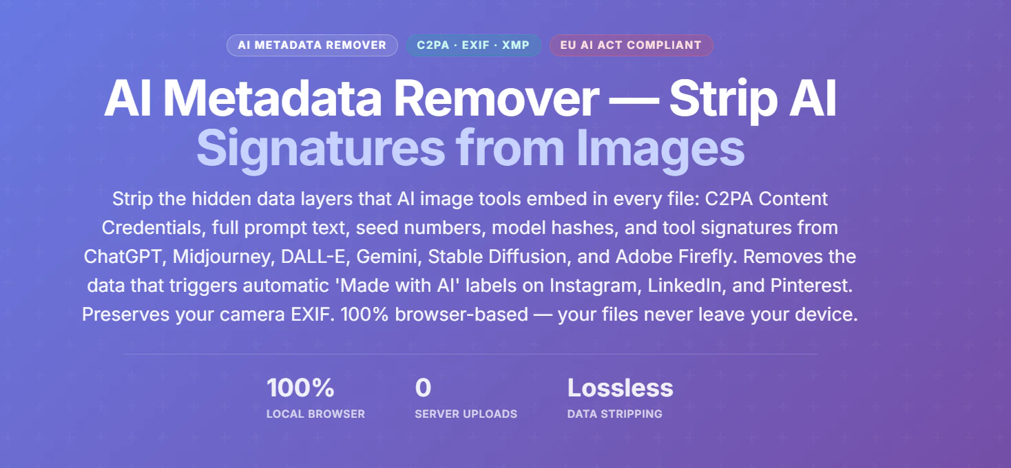 Remove AI metadata from DALL-E, Midjourney, Stable Diffusion, and Gemini images. Strip C2PA crede...