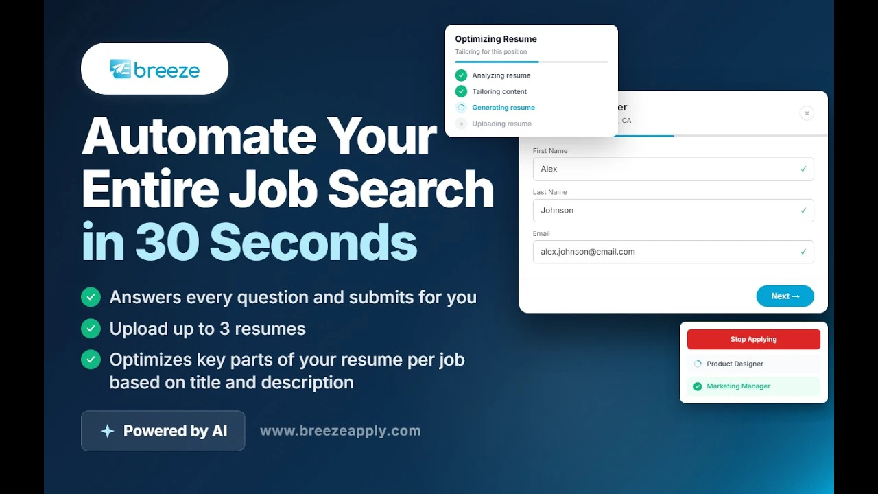 Breeze Apply is a free Chrome extension that automates job applications across LinkedIn, Indeed, ...
