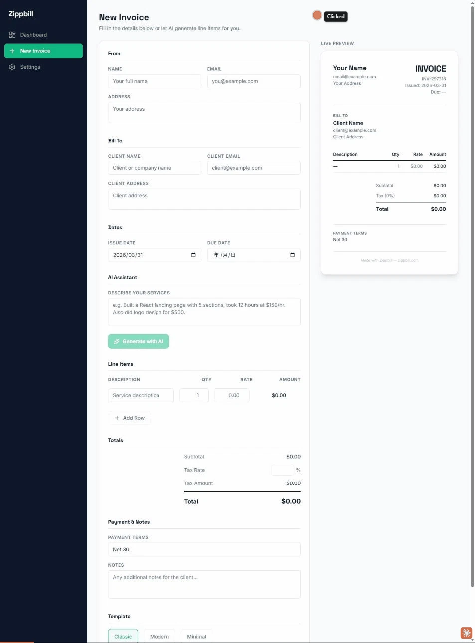 aZippbill turns plain English intoprofessional invoices instantly. Just describe whatyou did — "B...