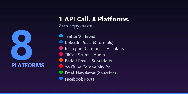 One API call generates ready-to-publish content for 8 platforms from any article. You get: Twitte...