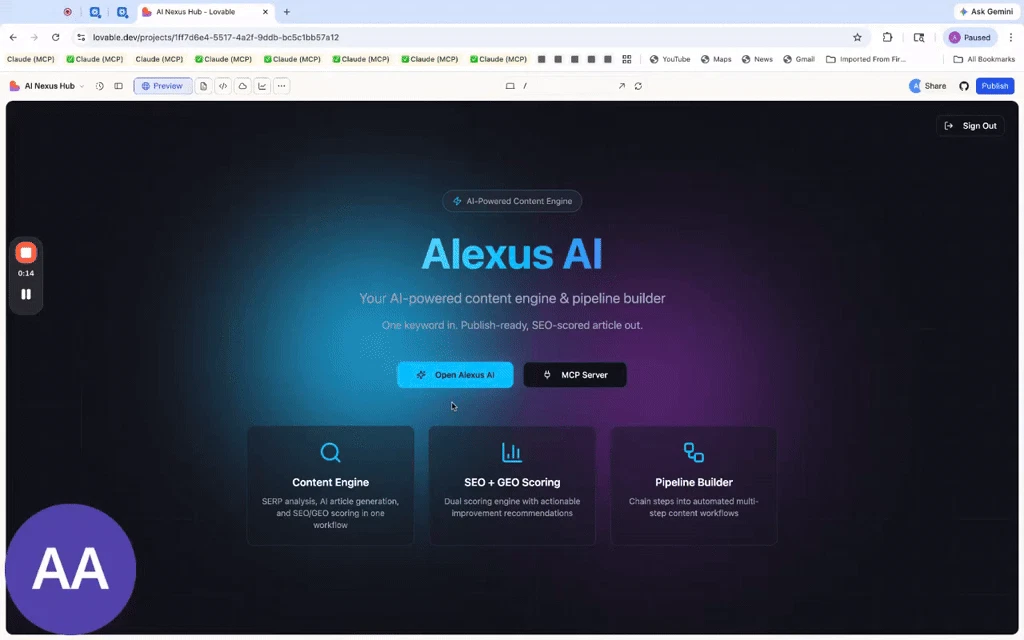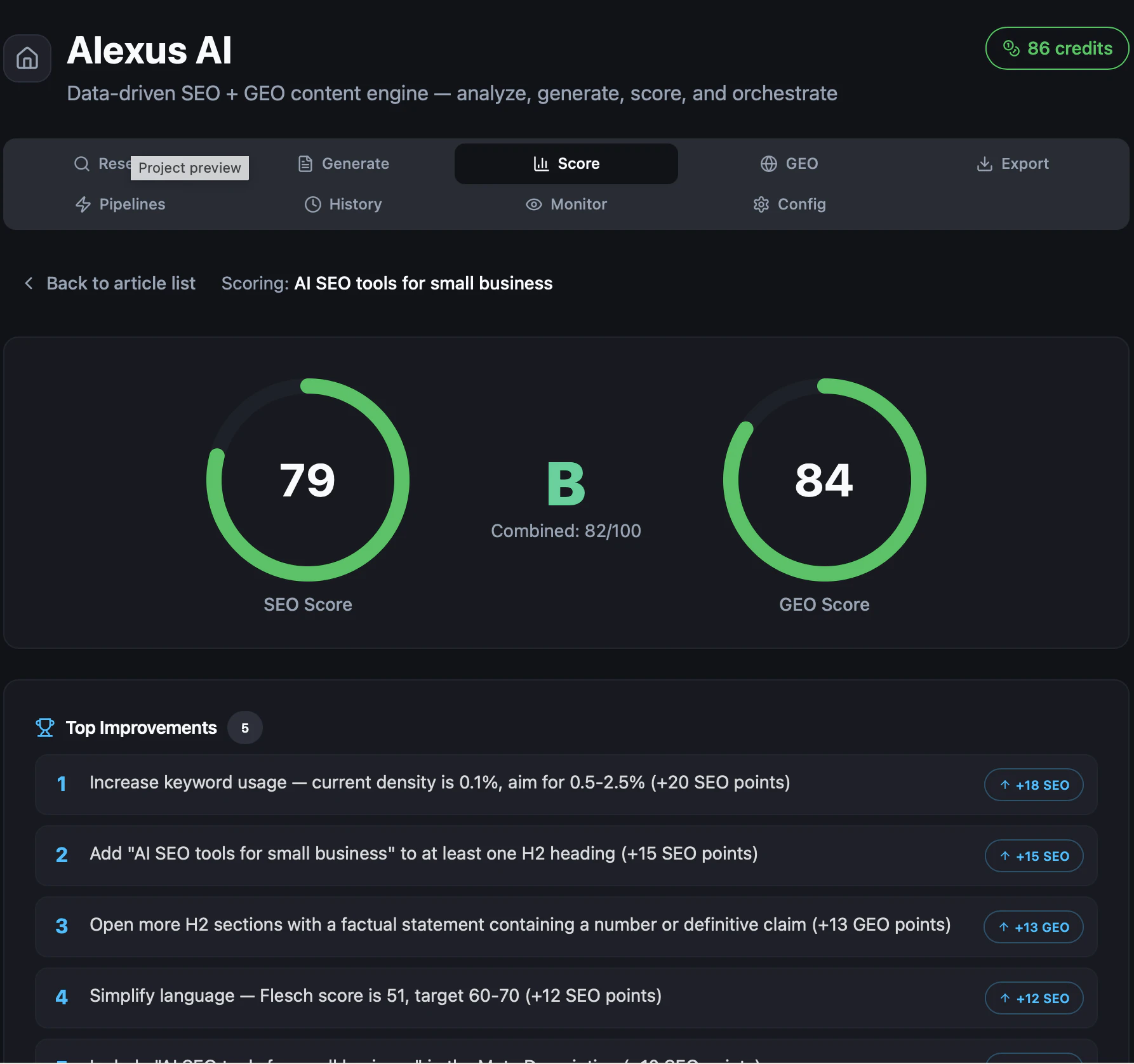 Alexus AI scores your content for both Google rankings AND AI citations (ChatGPT, Perplexity, Goo...