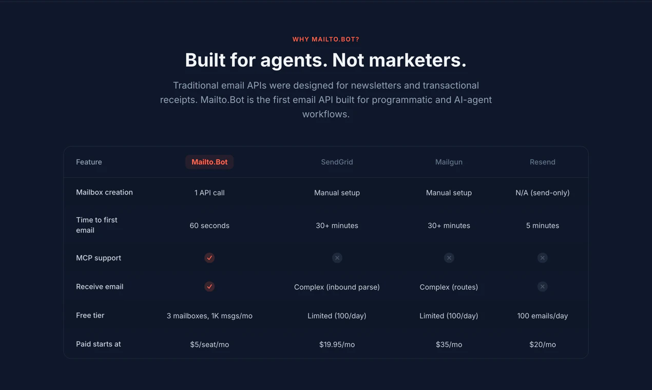 Email API designed for AI agents. One POST creates a working mailbox — no DNS, no domain setup. S...