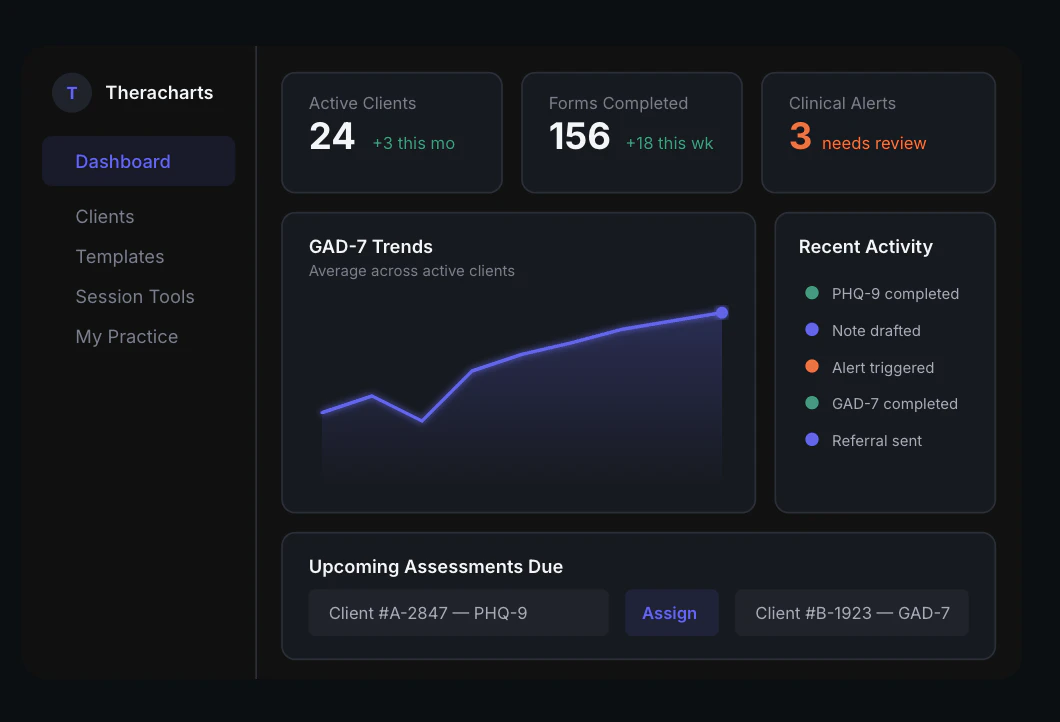 Theracharts puts clinical intelligence back in the therapist's hands. 120+ validated assessments ...