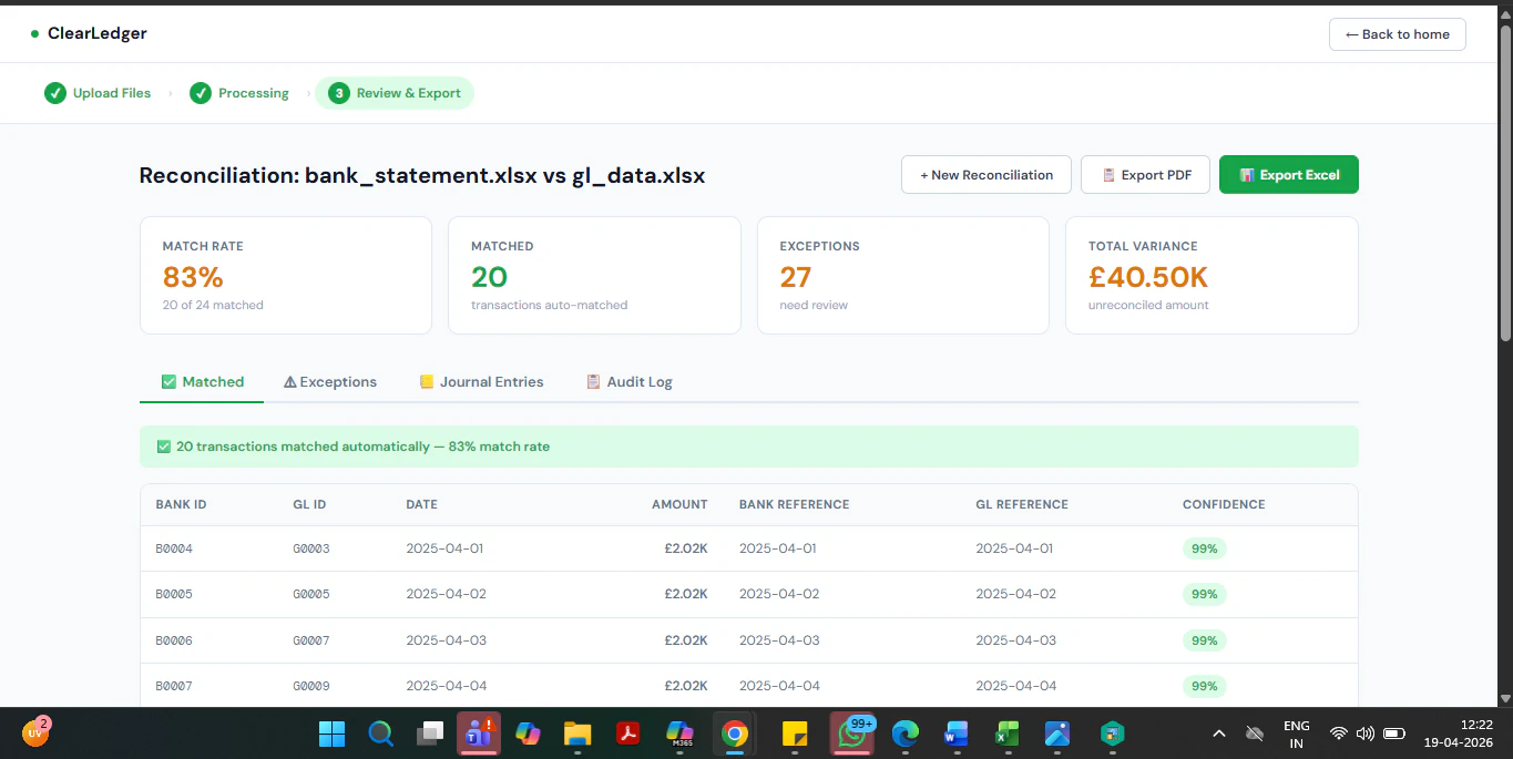 Finance teams spend 3-5 days every month manually matching bank statements against GL exports. Cl...