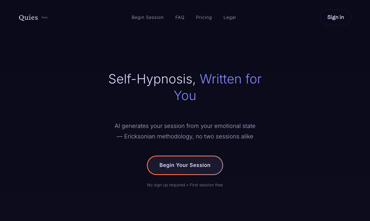 Quies generates personalized self-hypnosis sessions using Ericksonian methodology. You talk to an...