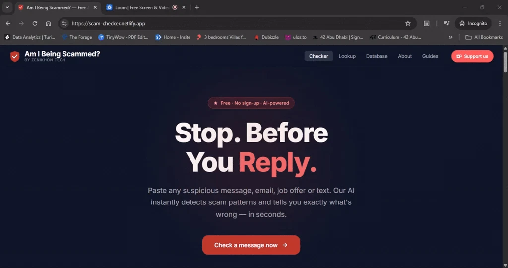 Free AI Scam Checker built to protect people from fraud.