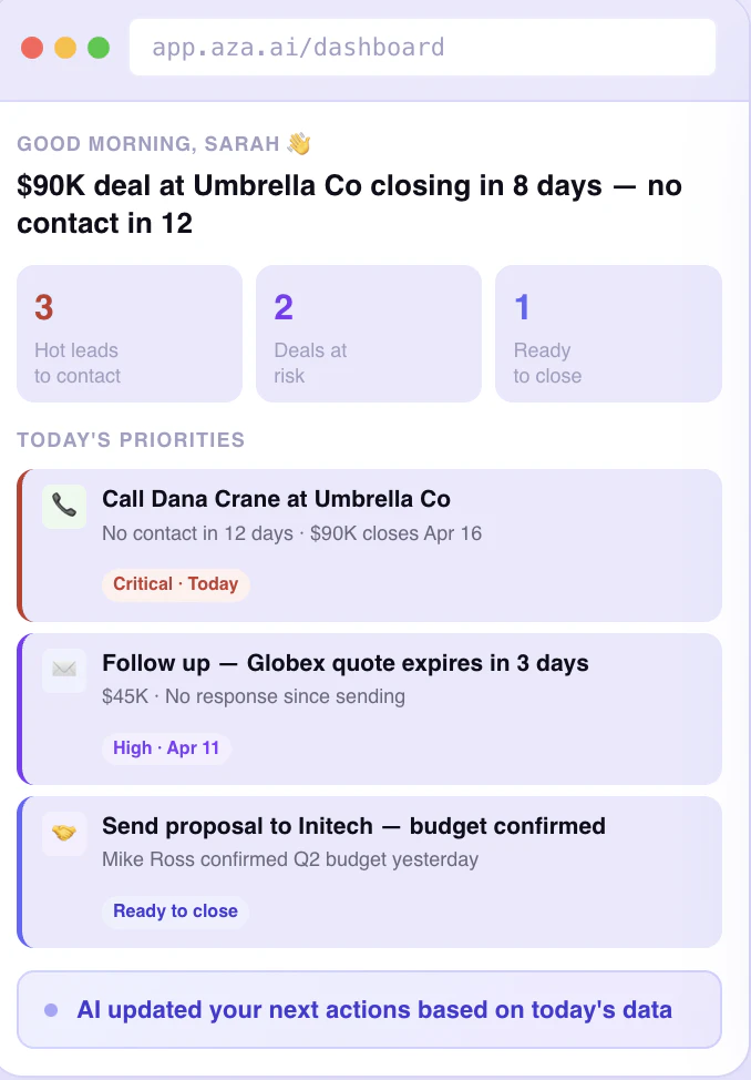 AZA reads your emails and meetings, scores your deals, and tells your team exactly what to do nex...