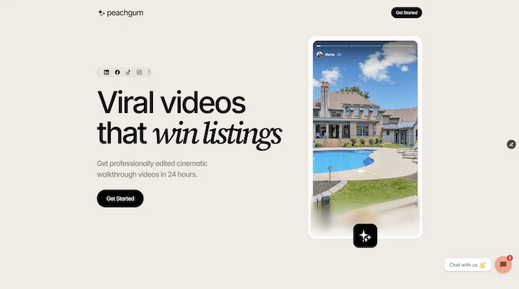 Upload your listing photos, pick a visual style and soundtrack, and Peachgum generates a cinemati...