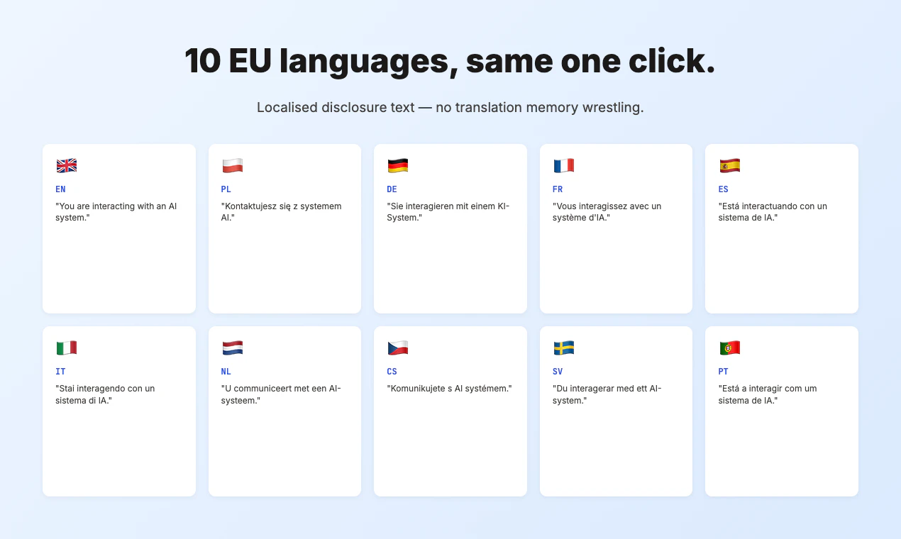 Ship EU AI Act Article 50 disclosures in 60 seconds