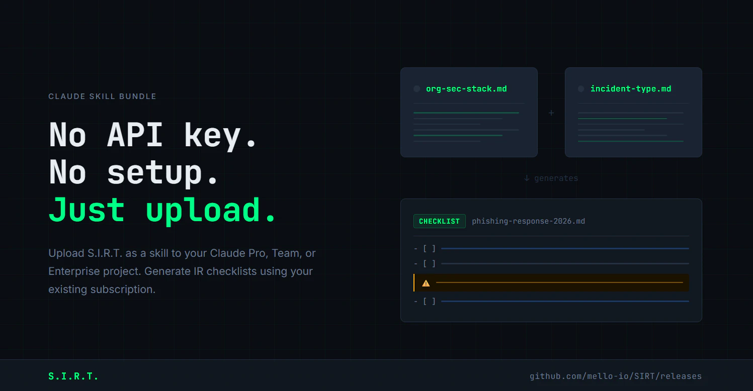 S.I.R.T. generates stack-specific, MITRE ATT&CK-tagged incident response checklists for L1 SOC an...