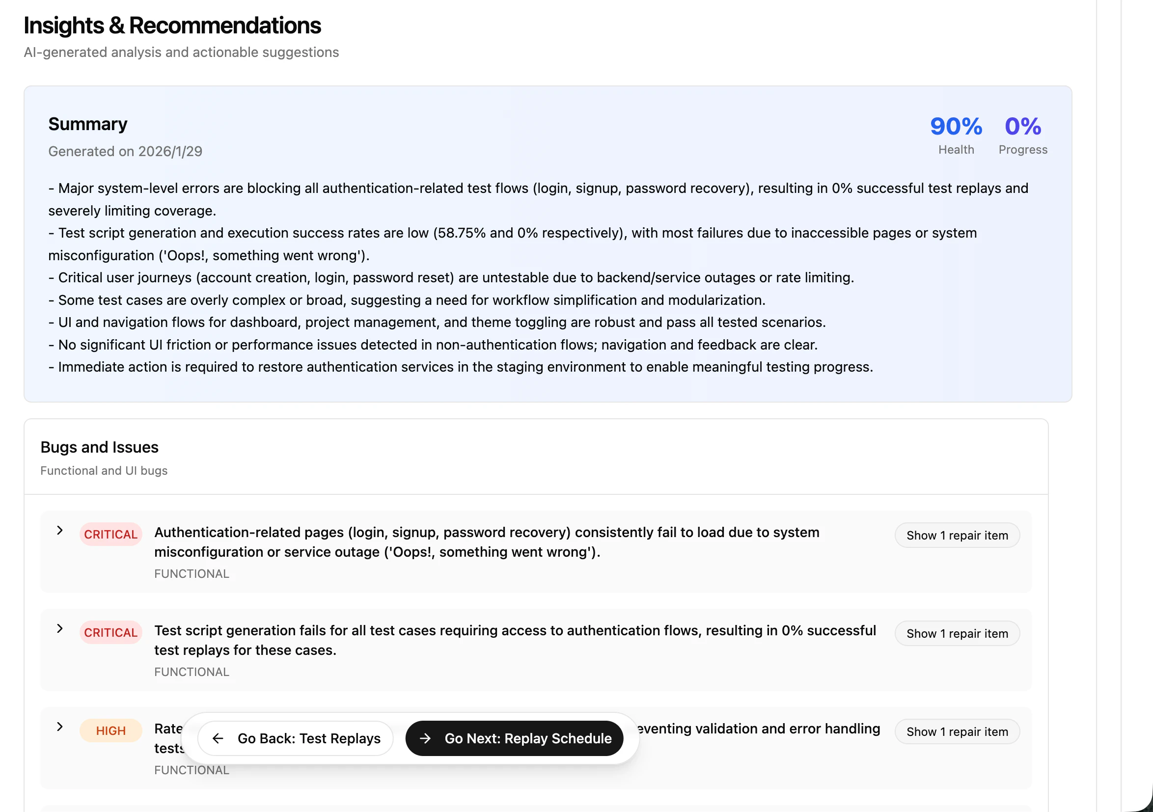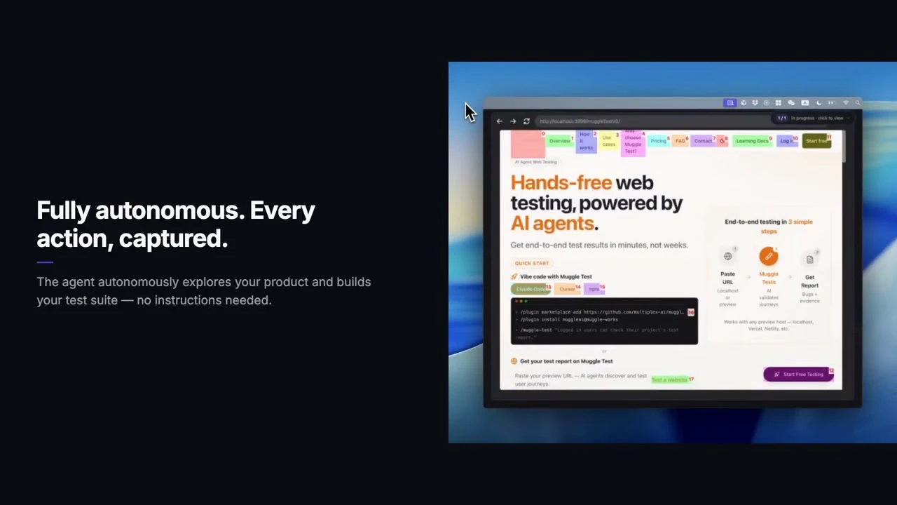 Paste a URL. Muggle Test walks through your web product like a real user — signup, navigation, er...
