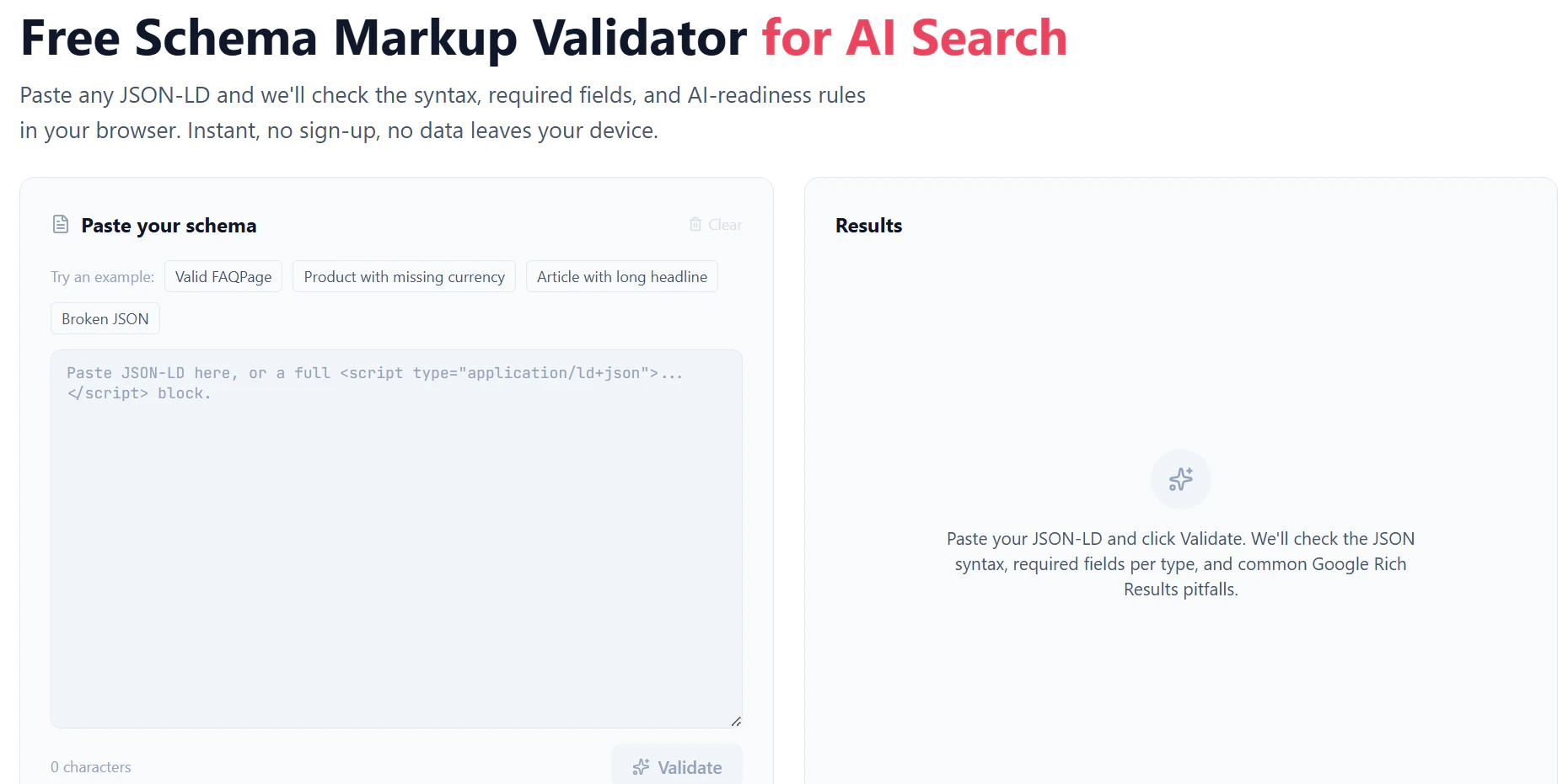 SchemaForAI generates JSON-LD structured data optimized for AI search engines like GPT, and Googl...