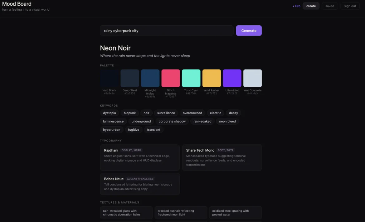 Type any mood or aesthetic and instantly get a full mood board — color palette, typography, textu...