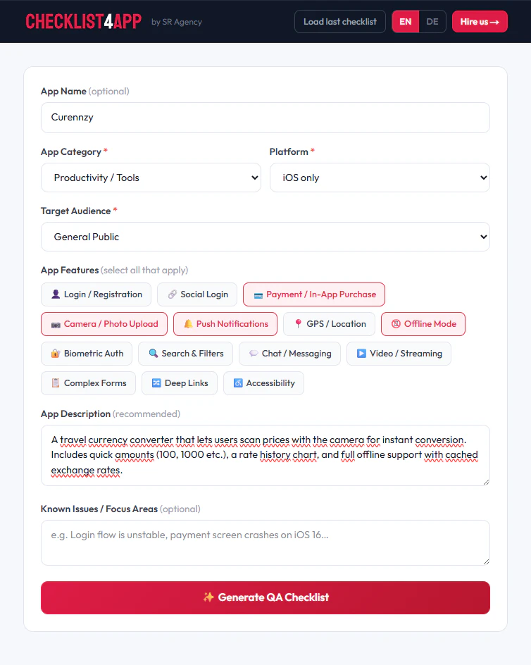 AI-generated QA checklists for your mobile app. Free.