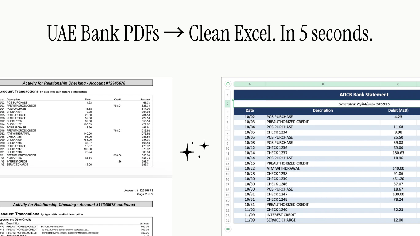 Convert Emirates NBD, ADCB and other UAE bank statement PDFs to Excel in seconds. Supports passwo...