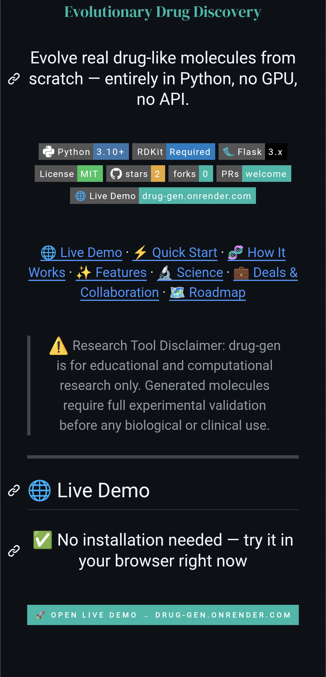 drug-gen lets you generate and evolve real drug-like molecules using a genetic algorithm. It vali...