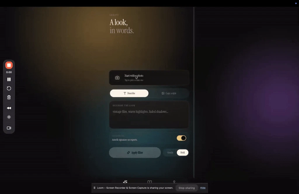 Asterik is an AI photo color-grading tool. Describe a film stock or mood in words — "vintage Koda...