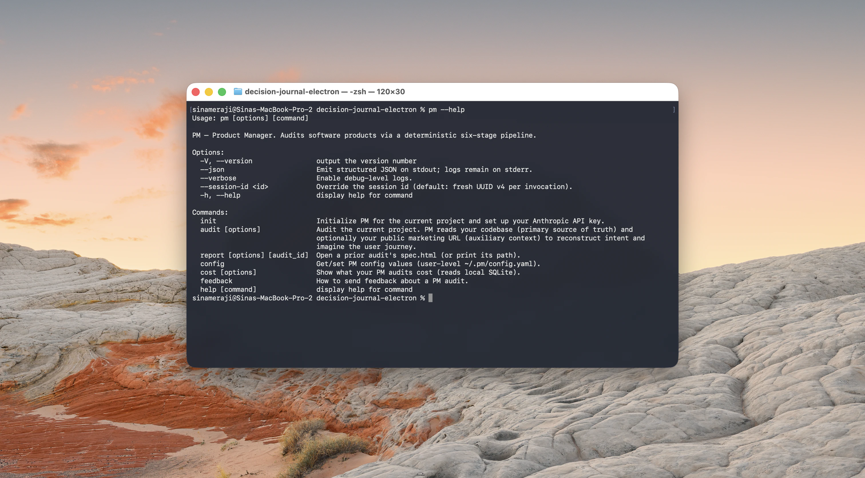PM — open-source Product Manager CLI. Audits software products via a deterministic six-stage pipe...