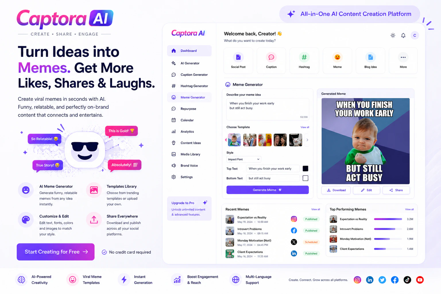 Generate captions, hashtags, posts, and memes in seconds—but unlike other AI tools, Captora creat...