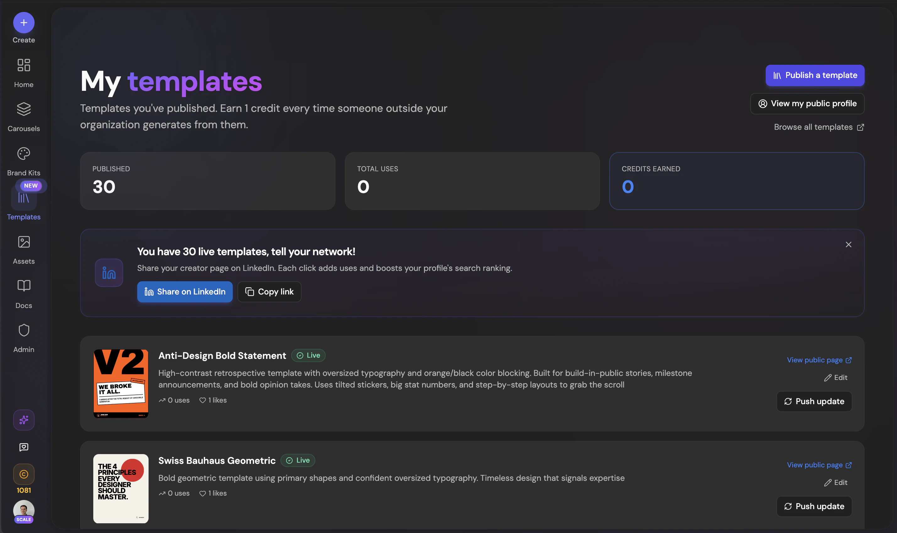 Carousels Generator now has a Templates Marketplace. Browse templates designed by creators, gener...