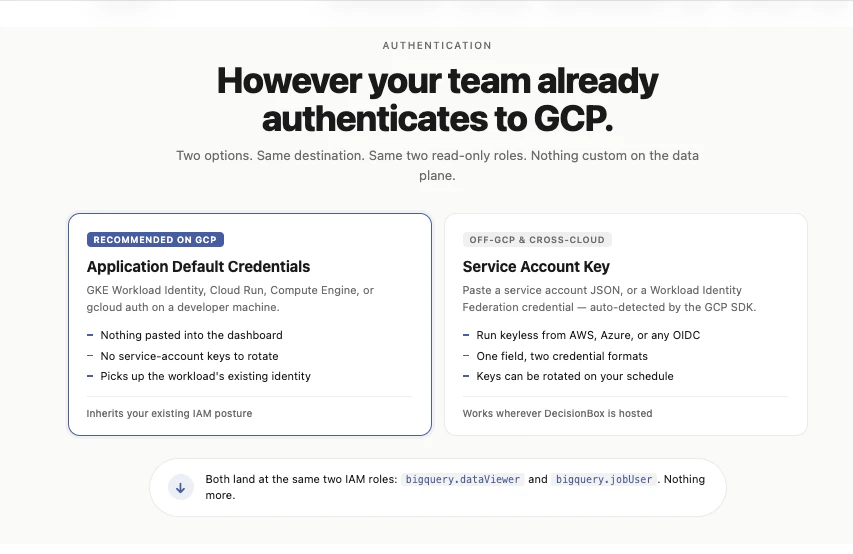DecisionBox connects to BigQuery in minutes — no schema migration, no pipeline. Read-only enforce...