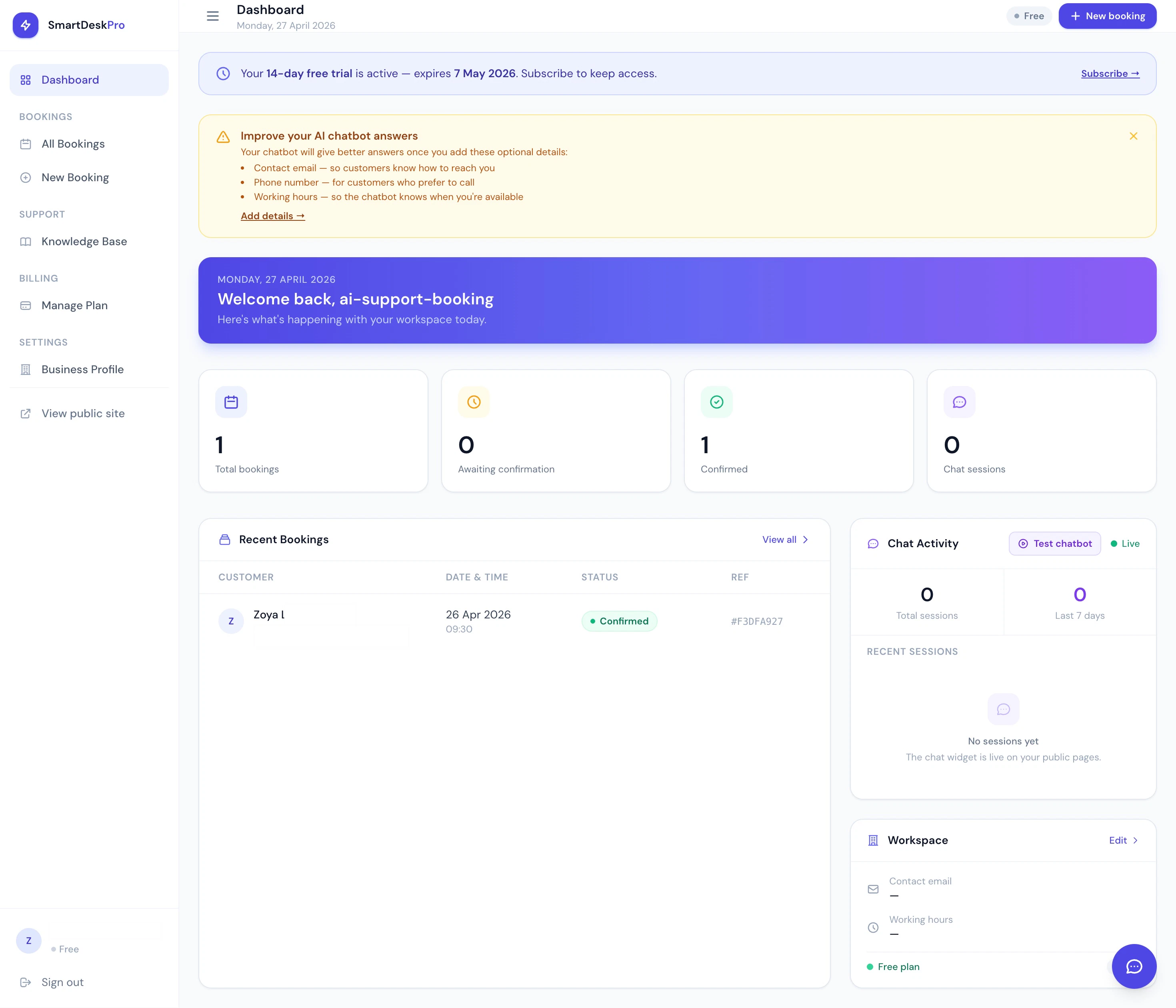 Booking pages and AI support for small businesses