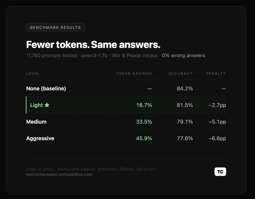 TextCompressor is a drop-in proxy that compresses prompts before they reach your LLM — removing s...