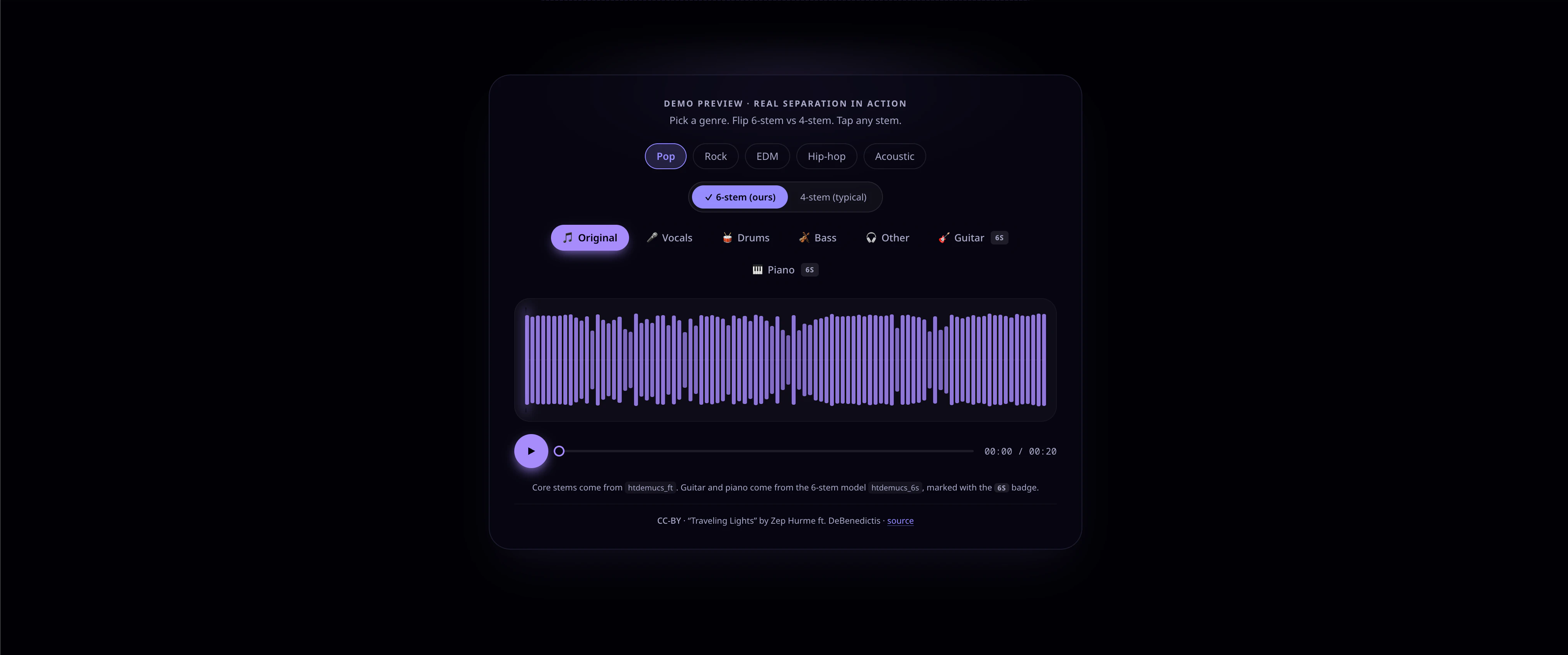 Drop in any song and get 6 clean stems back — vocals, drums, bass, guitar, piano, and other — in ...