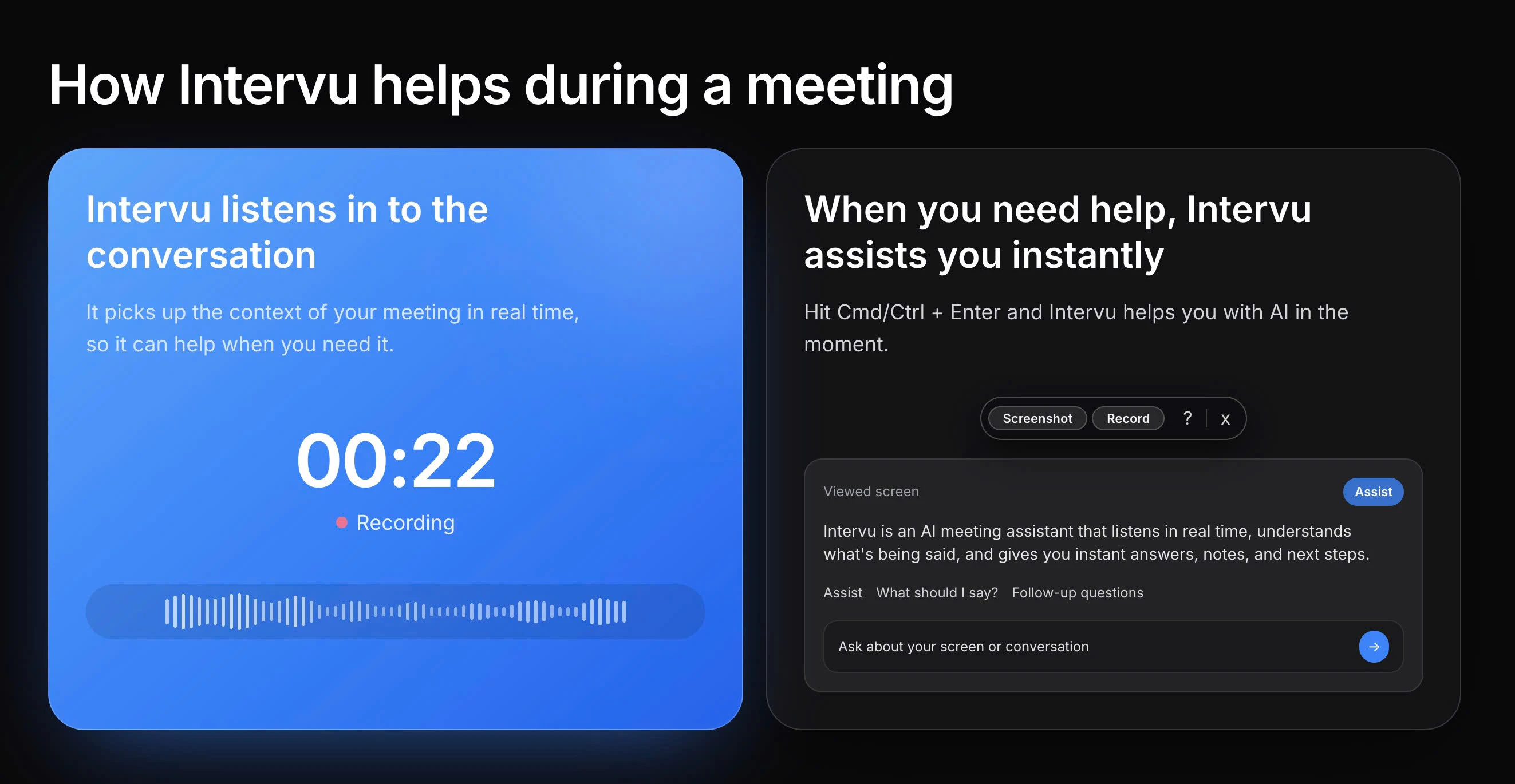 Intervu takes perfect meeting notes and gives real-time answers, all while completely undetectable