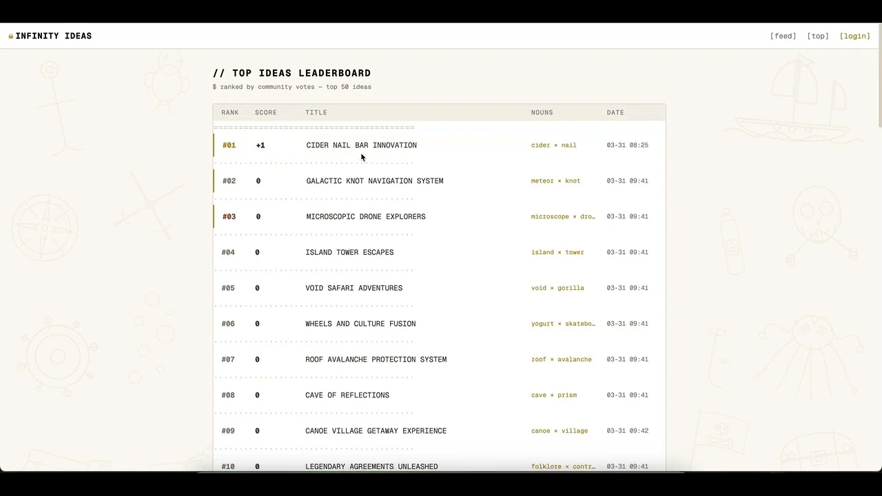 Every 10 minutes, 2 random nouns collide and AI turns them into a startup idea
