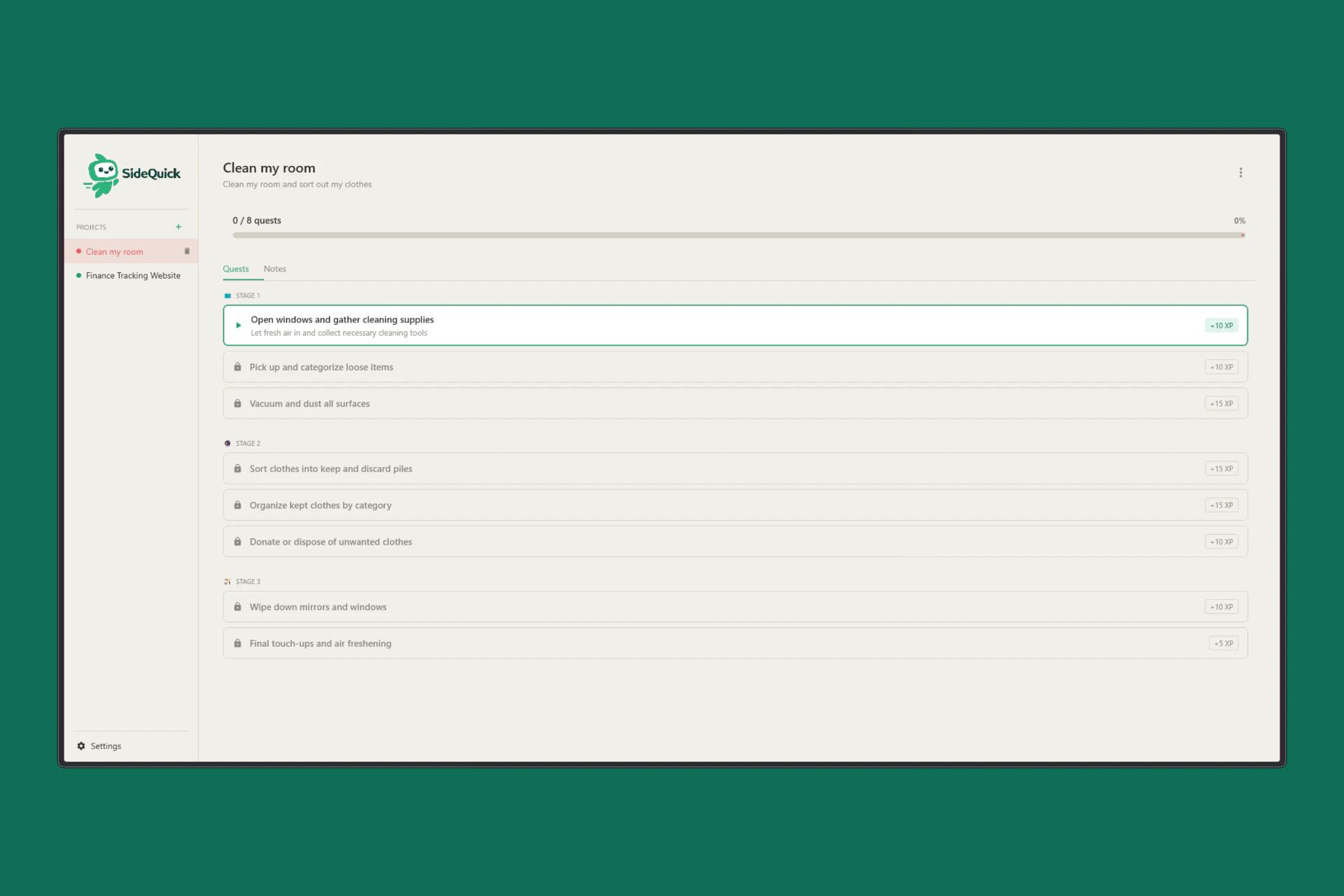 SideQuick breaks your projects into quests, keeps your streak alive, and always knows where you l...